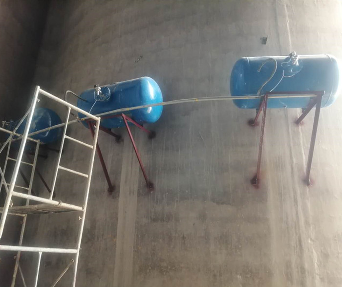 在經(jīng)過(guò)3天緊張的安裝后,我司啟動(dòng)空氣炮設(shè)備后,設(shè)備通過(guò)將8公斤壓力的壓縮氣體迅速噴放,大量的壓縮氣體通過(guò)排氣管進(jìn)入到筒倉(cāng)的倉(cāng)壁骨料處,壓縮氣體進(jìn)入后迅速膨脹,將板結(jié)和粘附的骨料與倉(cāng)壁的摩擦力破除,從而打破筒倉(cāng)內(nèi)架橋的支點(diǎn),使物料重新恢復(fù)流動(dòng)。